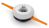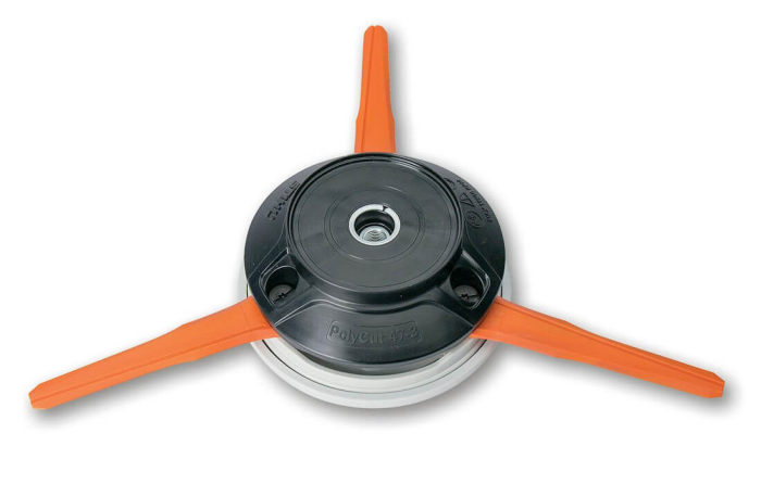 This is a multi-purpose cutting tool with three thermoplastic blades that are ideal for hard-to-reach places and large areas of high-growing grass. The blades are mounted on bushings and extend when the engine is brought up to operating speed. The white thermoplastic blades are also ideal for trimming around monuments and other solid objects as they don’t mark the stone. The blades are easy to change and some models can also be fitted with flexible nylon line in addition to or in place of the blades.