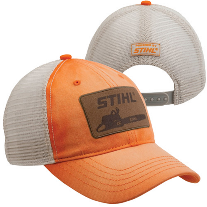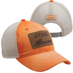 Washed orange twill and off-white mesh cap. Front patch screened with STIHL logo and chain saw. POWERED BY STIHL® label sewn over back vent. Plastic tab back closure.
