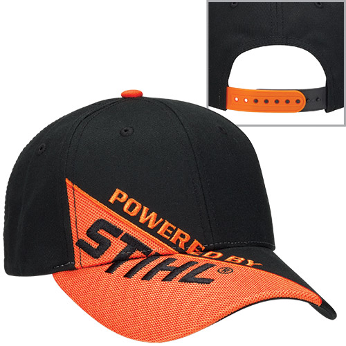 Black twill cap with orange mesh appliqué on side visor and crown. Embroidered POWERED BY STIHL® on the crown and bill. Adjustable two-tone snap back closure.
